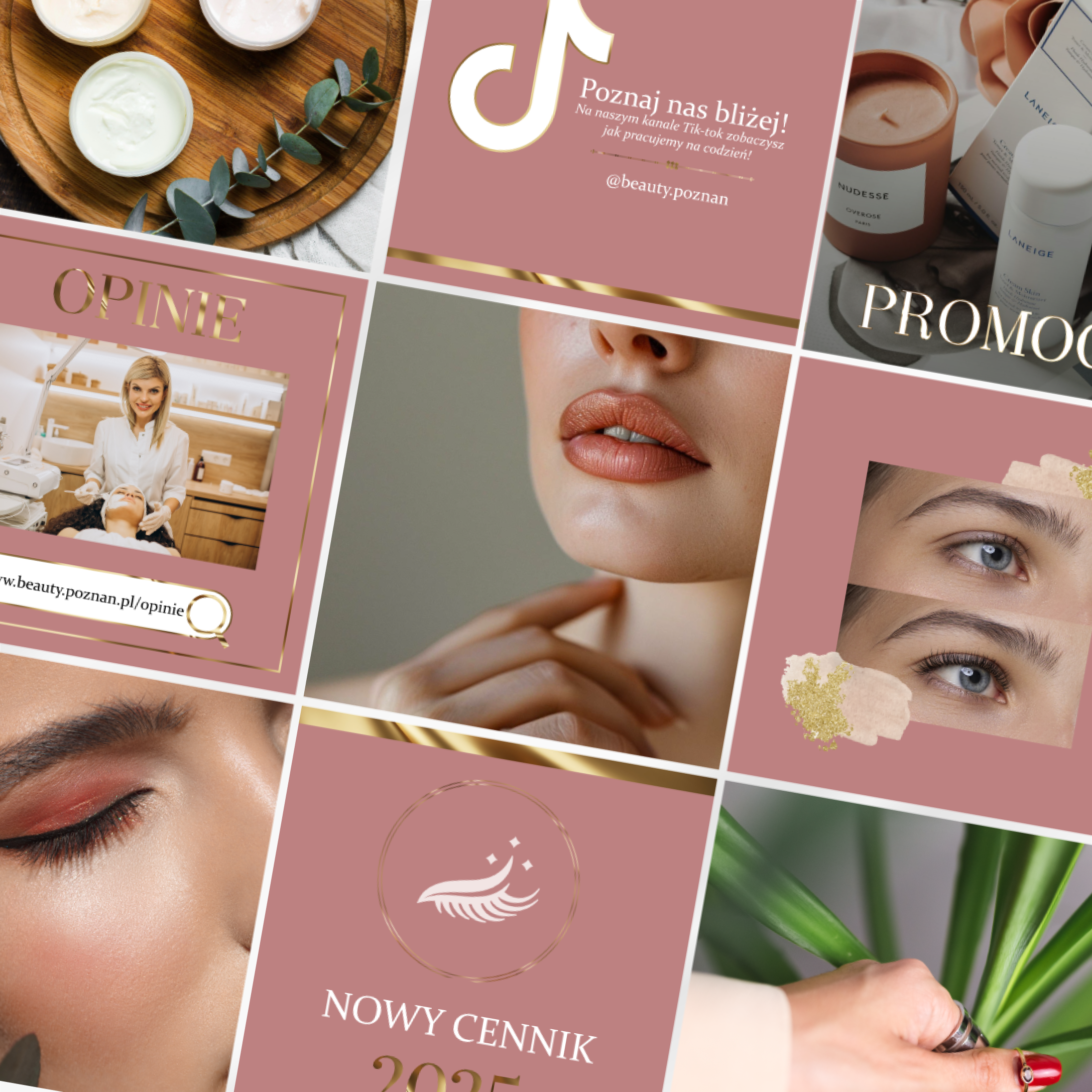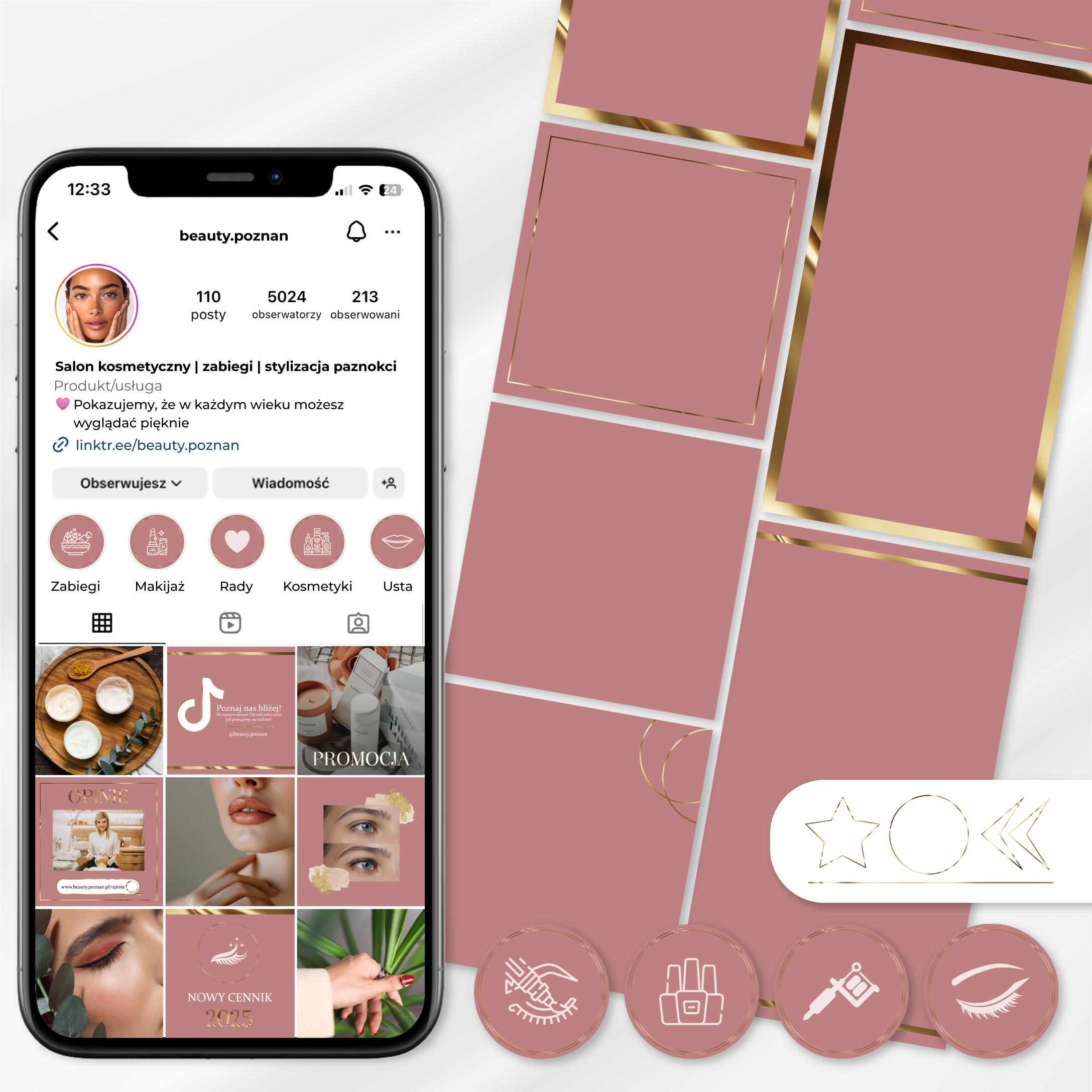 Beauty paczka to zestaw teł i ikon na social media stworzonych z myślą o branży beauty, salonach kosmetycznych, fryzjerskich, blogerkach kosmetycznych i wszystkich, którzy pragną nadać swoim mediom społecznościowym profesjonalny i estetyczny wygląd. Gotowe tła podkreślą piękno Twoich postów na Instagramie, Facebooku czy innych platformach społecznościowych, a dodatkowo możesz uzupełnić je ikonami, które również znajdziesz w zestawie, m.in. strzałki, kreski, koła, kwadraty.